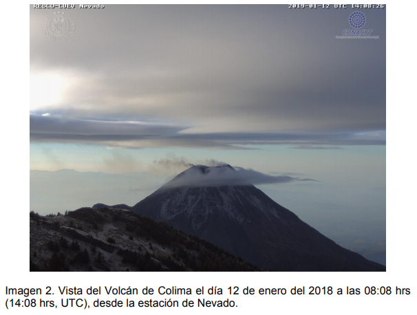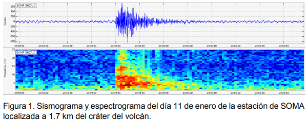 En la última semana se contabilizaron de forma automática 5 eventos de alta frecuencia (HFs), 3 derrumbes y 25.5 min de tremor de baja amplitud. En la figura 1 se muestra el sismograma de la estación de SOMA localizada a 1.7 km del cráter del volcán, en donde se puede apreciar la señal sísmica de un HF del día 11 de enero a las 17:49 hrs (23:49 hrs, UTC).